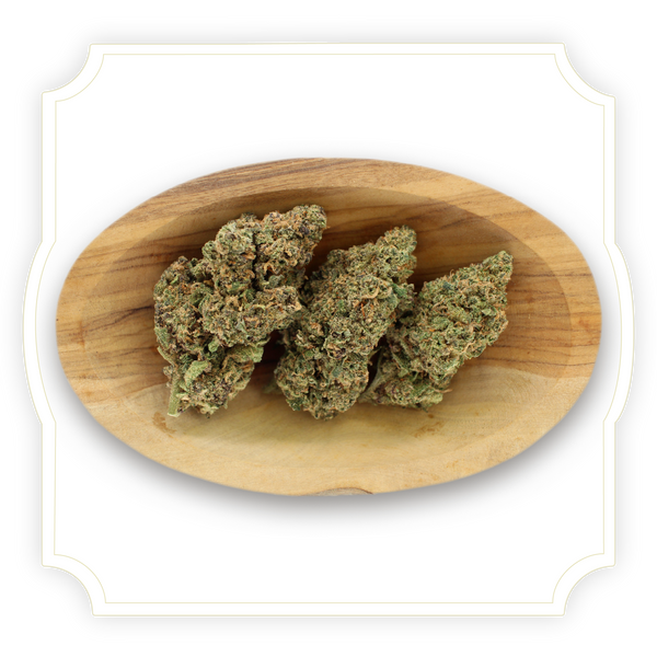 Dutch Punch CBD flower close up in wooden bowl on white background